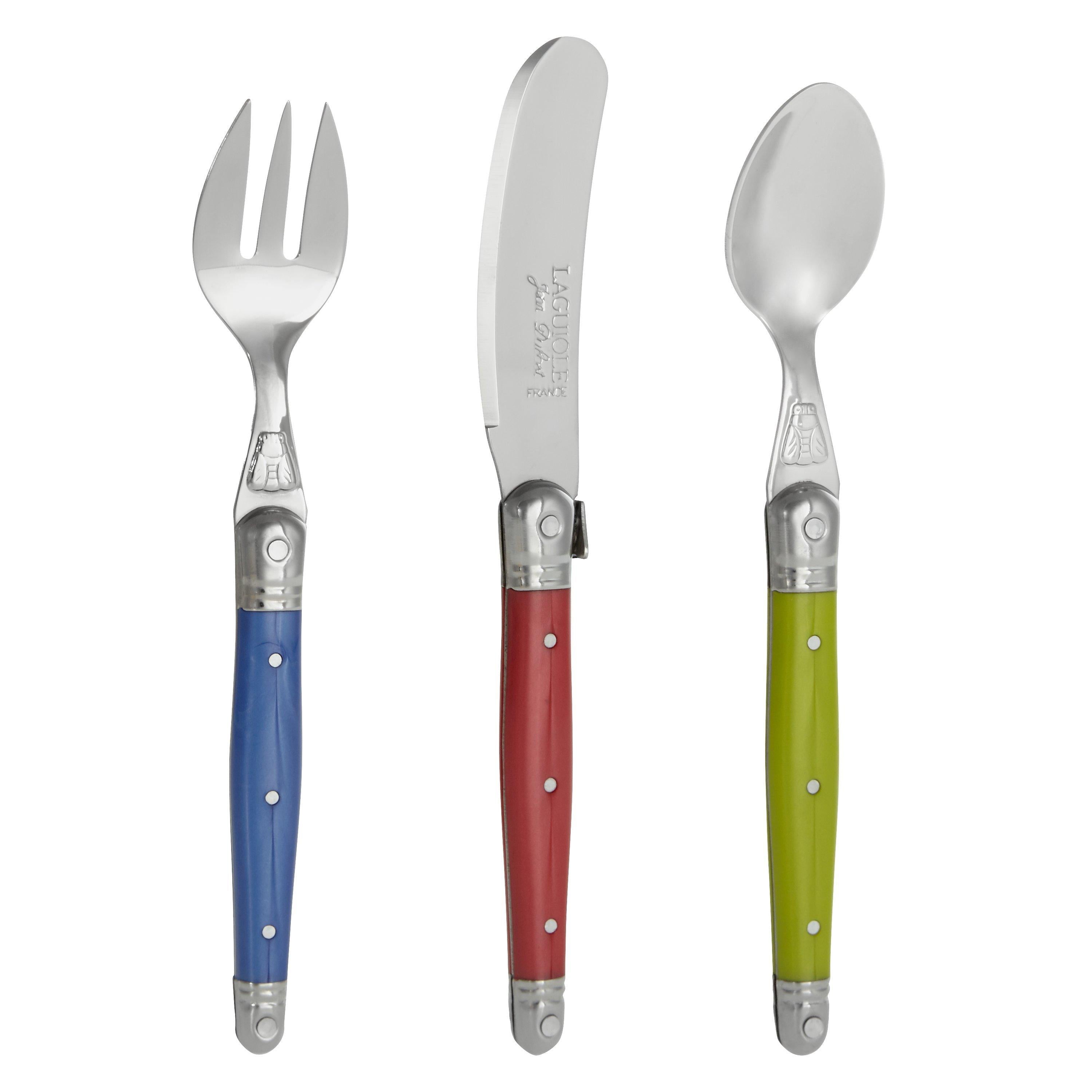 Read MoreGreat for first meal times with the family, this kids' cutlery set includes a knife, fork and spoon, made of durable stainless steel with ABS handles for comfortable holding. A contemporary twist on Laguiole's classic cutlery, the handles feature a subtly iridescent glow in different luminous colours. Dishwasher safe for easy and hygienic cleaning.