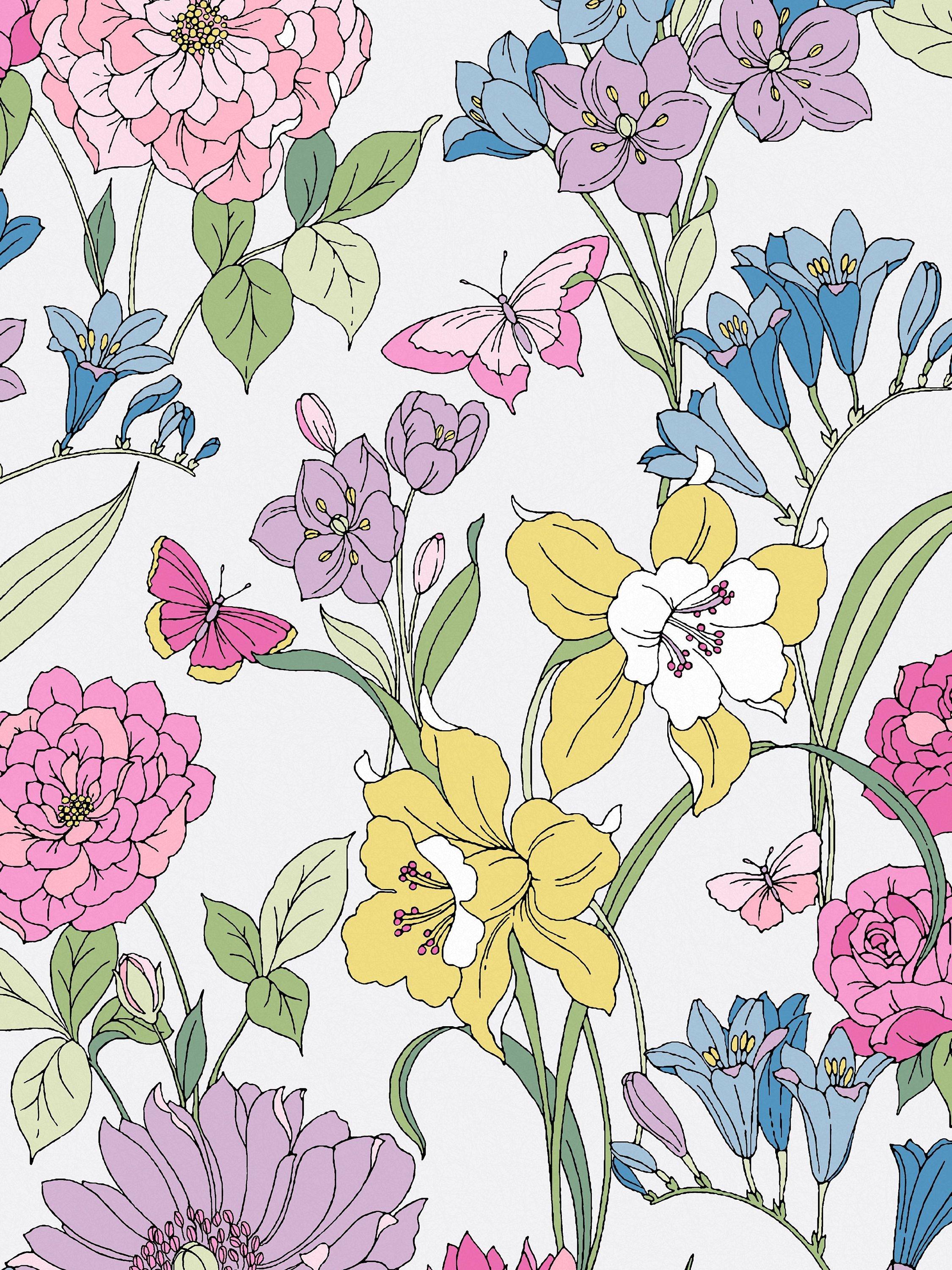 Reviews Inspired by a piece of painted artwork, this charming line-drawn floral design features an abundance of stylised blooms like dahlias, daffodils and delphiniums forming a continuous pattern. Delicate butterflies perch on curling stems in this striking print.
