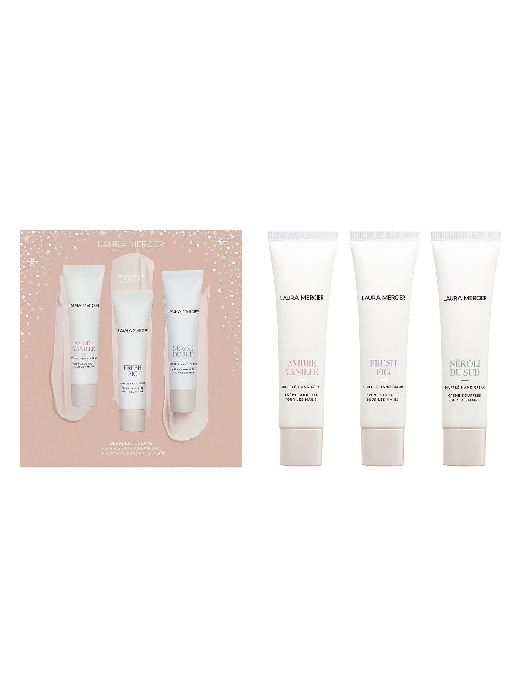 From the lights that illuminate the Cirque d'Hiver to the twinkling streets of New York, the magic of winter enchants all. Step inside and be captivated by a flawless fantasy only the season inspires. Leave utterly enchanted, enlivened by flawless beauty only Laura Mercier can create.3 travel size hand creams in best-selling fragrances - Ambre Vanille, Neroli Du Sud - plus one beloved scent back for a limited time - Fresh Fig. Made with a blend of French Olive Oil, French Plum Seed Oil and Glycerin to help restore the skin’s elasticity, while Tapioca Starch creates a blurring and skin-evening effect to eliminate dry skin and cracks, leaving behind perfect-looking skin with an elegant sheen. Benefits:- Instantly moisturises hands and improves skin texture- Delivers long lasting moisture and hydrationClaims:- Instantly moisturises and hydrates- Provides moisturisation and hydration that lasts for up to 24 hours- The hand cream improved my skin texture (100%)- The hand cream improved the smoothness of my skin (100%)- My skin felt soft after using the product (100%)Source: Based on an independent US consumer study on 30 participantsTechnologies:- Skin-friendly naturals that support the body’s cellular turnover for healthy, glowing skin.Key ingredients: French Algae: Restores skin’s moisture with omega fatty acids and hydrating polysaccharides.Olive Leaf?: Antioxidant and antimicrobial extract stimulates cell regrowth.French Plum Oil?: Naturally plumping, increases cell turnover, lightweight, and non-comedogenic?.Starflower Oil: Laura’s secret ingredient for healthy skin soothes via antioxidants and linolenic acid. How to use: Warm a generous amount of cream between the hands, then gently massage it into the palms, back of the hands, nails, and cuticles. Pro-tip: As an intensive mask, twice weekly, apply a thick layer to the hands and leave on for 10 minutes to nurture the skin.