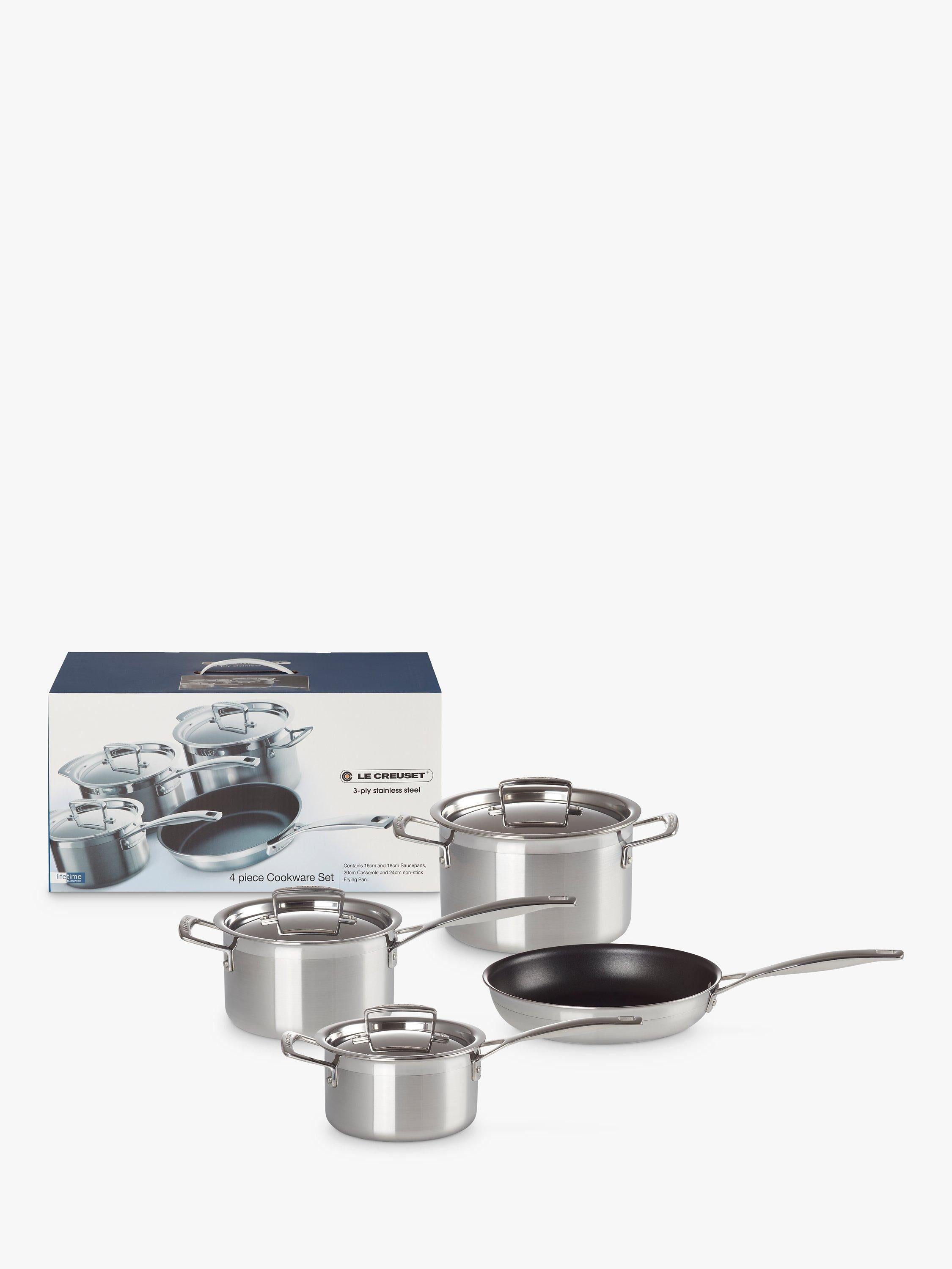 4.2/5 A perfect introduction to the 3-ply Stainless Steel range from Le Creuset, this four-piece cookware set contains a 16cm Saucepan, 18cm Saucepan, 20cm Deep Casserole and 24cm non-stick Frying Pan. An ideal collection for most everyday cooking needs.