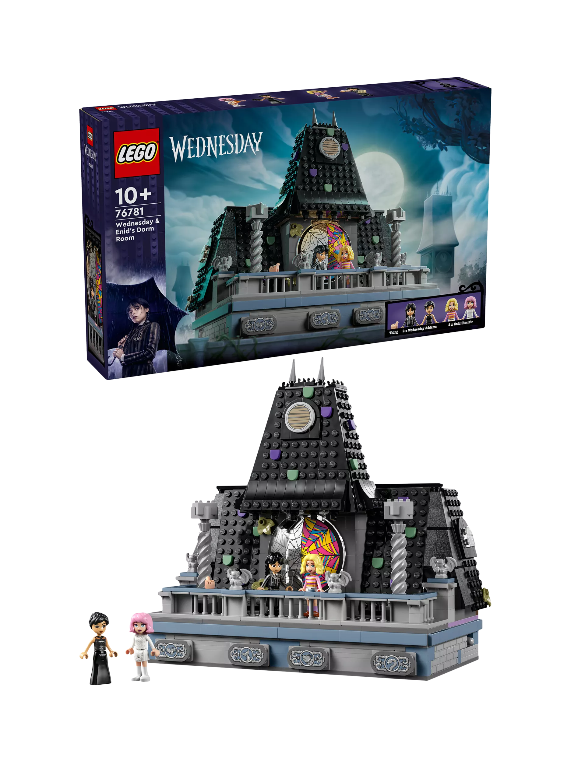 Welcome back to Nevermore Academy with this Wednesday & Enid’s Dorm Room (76781) mystery and adventure playset for kids and fans aged 10 and over. The detailed LEGO® Wednesday Addams gift set features four collectable Wednesday and Enid mini-doll figures, the character Thing and a dorm room model.