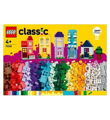This LEGO Classic set, model 11035, encourages open-ended creativity for young builders aged four and older. It contains a vibrant assortment of colourful bricks designed for imaginative construction projects. The set offers clear inspiration for building various small structures, focusing specifically on creating charming houses and neighbourhood scenes.