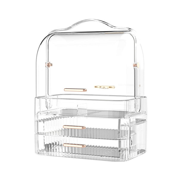 a top section 2 drawers and 2 side compartments provide ample storage space the modern aesthetic adds a touch of elegance to any vanity or countertop perfect for small bathrooms or vanities with limited space equipped with a handle for easy portability and mobility specifications product type makeup organizer size 265cm w x 182cm d x 347cm h colour transparent material plastic mount type freestanding drawers included yes number of drawers 2 package content 1 x makeup organizer package specifications package dimensions wxdxh 38 x 30 x 22cm gross weight 205kg