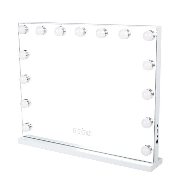 Large Hollywood mirror with 15 bright LED lamp bulbs Touch dimming control and 3 colour lighting available Bluetooth function allows the mirror to play music or answer phone calls Designed with a USB port to charge your phone/pad Overall Dimensions: 58cm W x 46cm H Mount Type: Freestanding Frame Material: Iron Power Source: Plug-in Plug Included: Yes Lighting Included: Yes Bulbs Included: Yes Number of Bulbs: 15 Dimmable Lighting: Yes