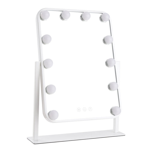 hollywoodinspired design with a white frame touchsensitive switch for easy light control crisp and clear mirror reflection delivers true picture durable metal construction keeps the mirror firm on your table specifications overall dimension 36cm w x 185cm d x 48cm h mirror dimensions 28cm w x 3cm d x 39cm h base dimensions 36cm w x 185cm d mount type freestanding material glassmdfmetal power source plugin plug included yes number of bulbs 12