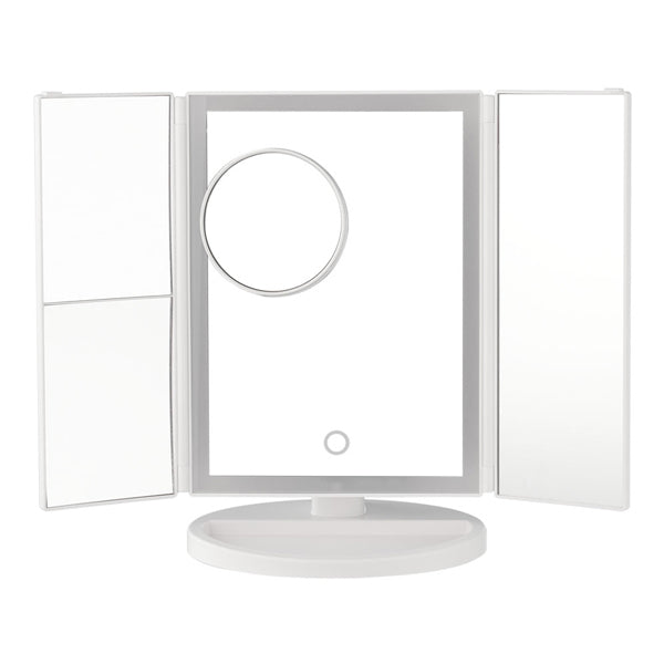 This tri-fold makeup mirror features a clasp for secure closure, ensuring easy storage and space efficiency. Made from premium ABS plastic, it's lightweight yet durable, making it perfect for travel.