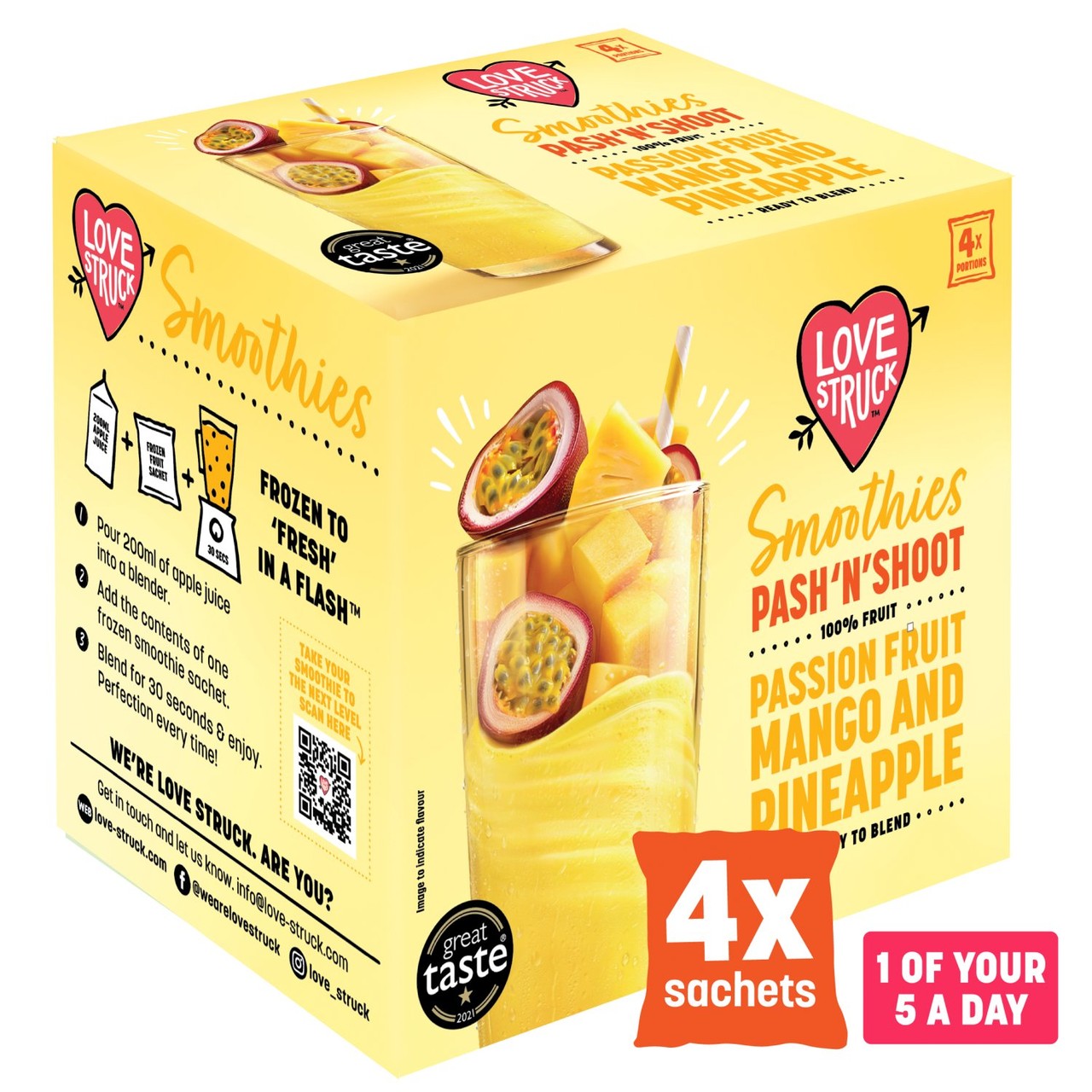 This Love Struck blend combines tropical flavours of passion fruit, pineapple, and mango into a convenient frozen format. These fruits are selected at their prime ripeness and then rapidly frozen to ensure maximum quality. This quick-freeze process effectively locks in the natural flavour profile and inherent nutritional goodness of the ingredients.