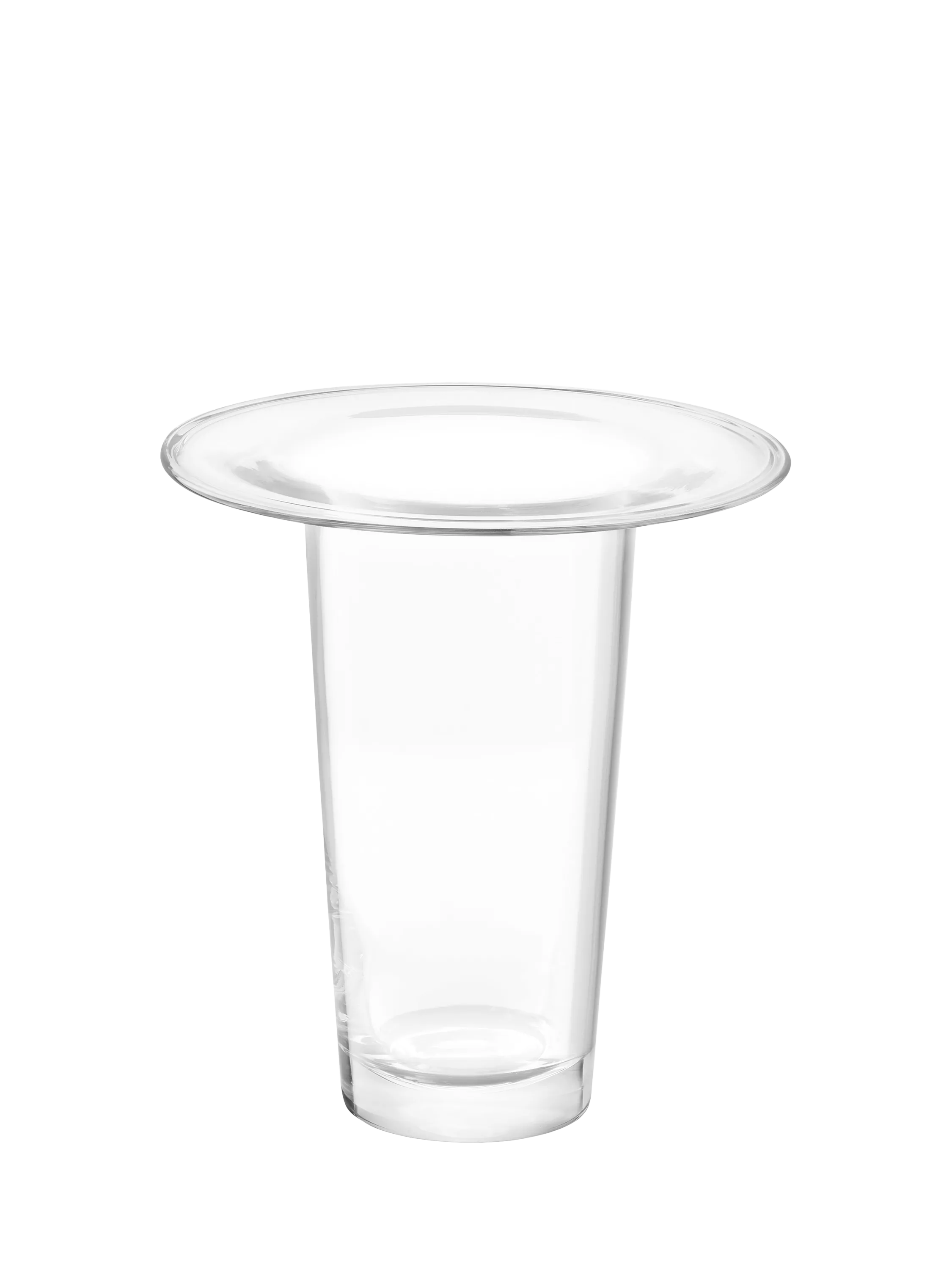 A mouth-blown vase or lantern with thick walls that fold outwards at the top into a wide and flat brim. Designed for seasonal displays, or a candle can be burned within.