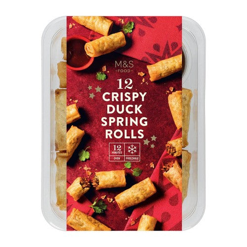 Enjoy a quick and flavourful Asian-inspired appetiser with these M&S 12 Crispy Duck Spring Rolls. Each pack contains twelve pastry rolls filled with tender duck meat, fresh vegetables, and a rich hoisin sauce blend. They are designed for convenience, pairing perfectly with the included hoisin dipping sauce pot for an authentic taste experience.