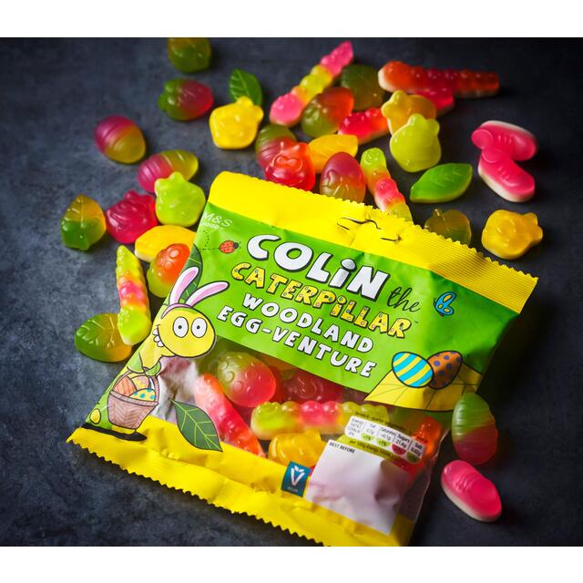 "M&S Colin The Caterpillar Woodland Egg-ventureLimited edition Colin the Caterpillar Easter themed fruit flavoured gums. Suitable for vegans."