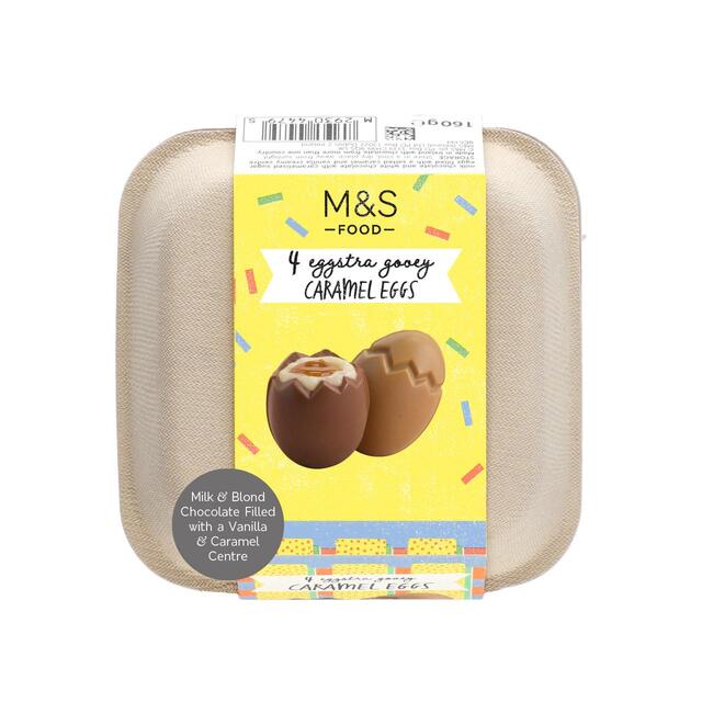 M&S Eggstra Gooey Caramel EggsFour eggstra gooey milk and blond chocolate eggs filled with a vanilla and caramel centre.