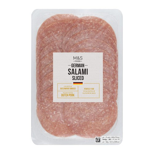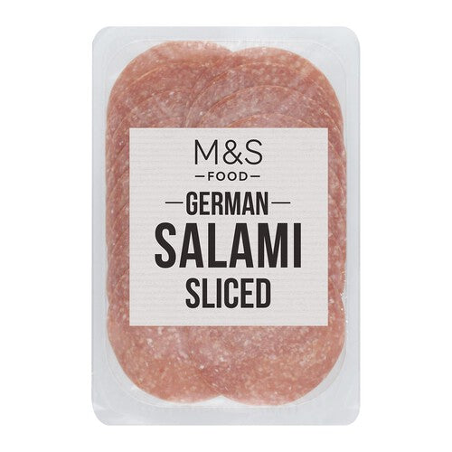 M&S Food presents this traditional German Salami, offered in convenient pre-sliced form for immediate serving. This dry-cured sausage features an appealing reddish-pink hue marbled with white fat flecks. The slices are packed securely in clear packaging, allowing full product visibility before purchase.