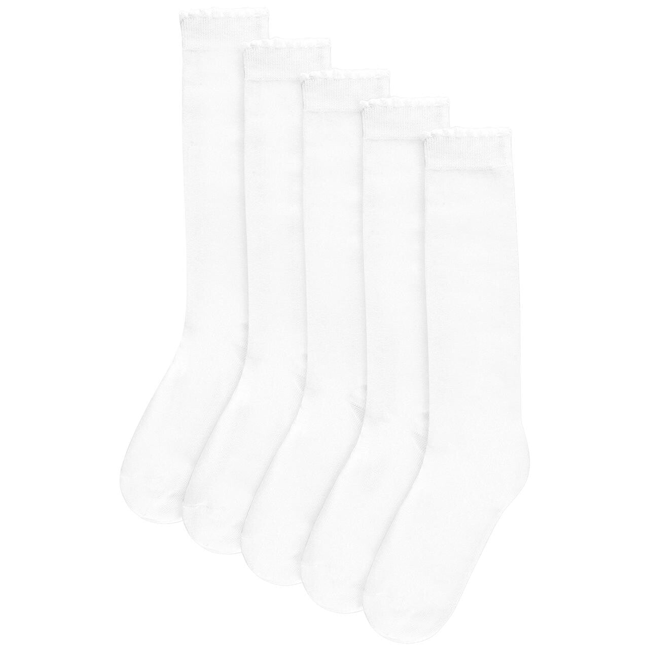 Stock up on daily essentials with this five pack of white girls’ knee high socks from M&S. These comfortable school socks feature an elegant scalloped trim, adding a subtle stylish detail to their everyday wear. They are designed using a soft cotton mix for improved comfort throughout the day.
