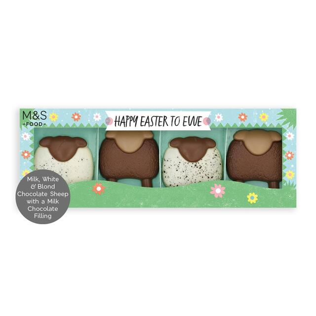 M&S Happy Easter To EweMilk, white and blond chocolate sheep, finished with a milk chocolate filling.