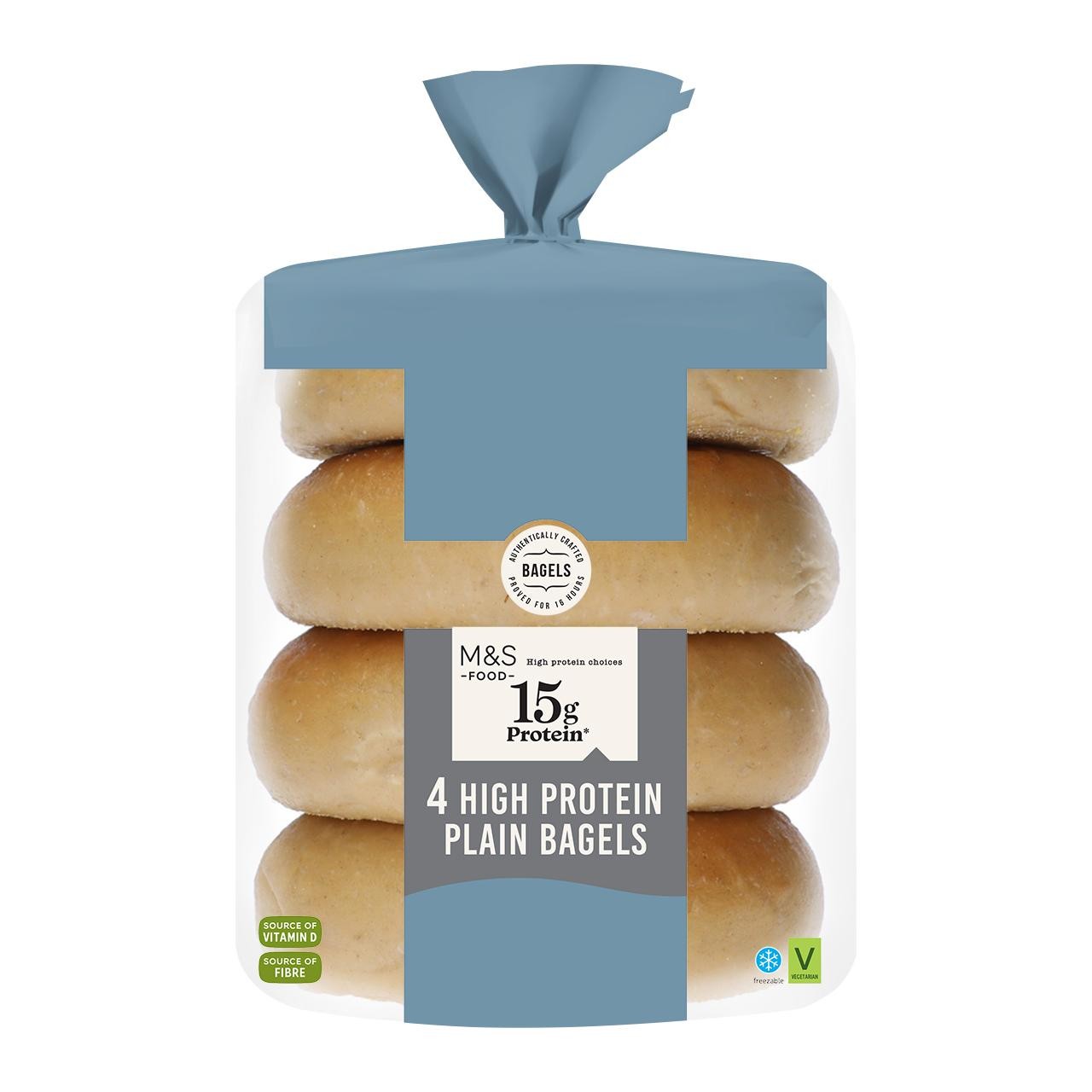 Enjoy these signature M&S Plain Bagels, specially formulated for a high protein boost to your meals. They are crafted using a blend of wheat and yeast protein, making them suitable for lunch. These bagels offer both taste and functionality for focused eating plans.