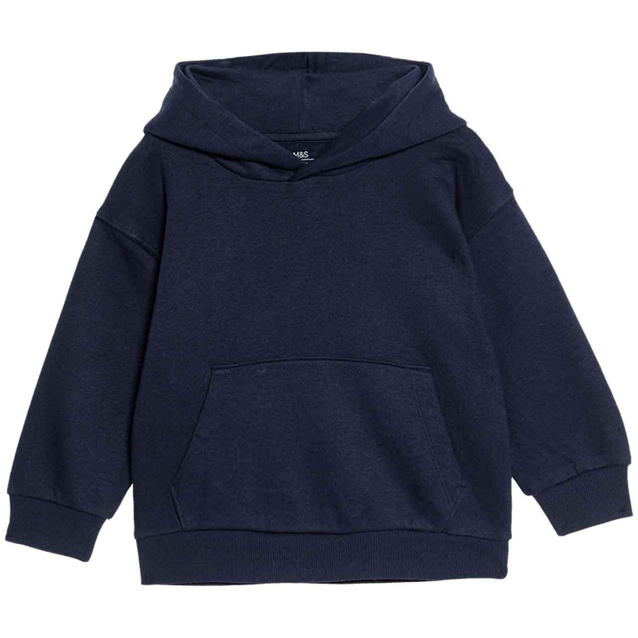 This M&S navy hoodie is designed as a versatile staple for their casual wardrobe needs. Crafted from a comfortable cotton-rich material, it ensures softness against the skin for daily wear during transitional weather. The relaxed regular fit guarantees ease of movement for active youngsters throughout the day.