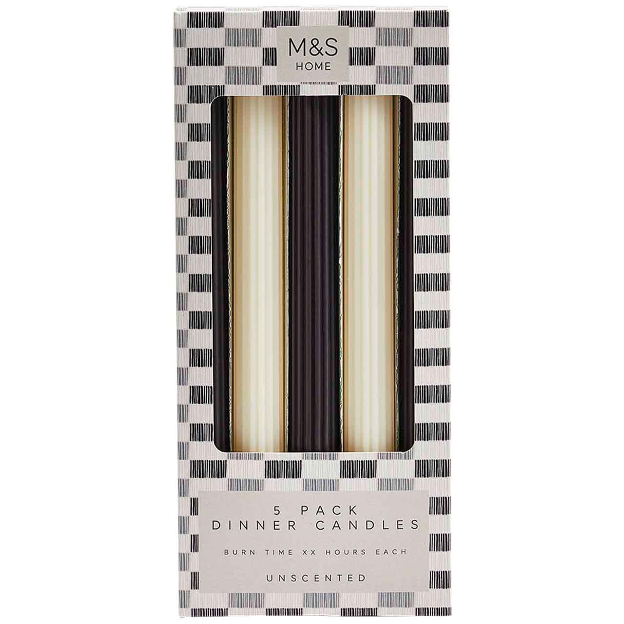 Create an elegant and inviting tablescape with this stylish set of five dinner candles from M&S for your home. These essential unscented candles allow ambient light to set the mood without any interfering fragrance during your meal or display time. Each piece features a contemporary vertical ridged detailing that beautifully catches surrounding light sources across your dining surface.