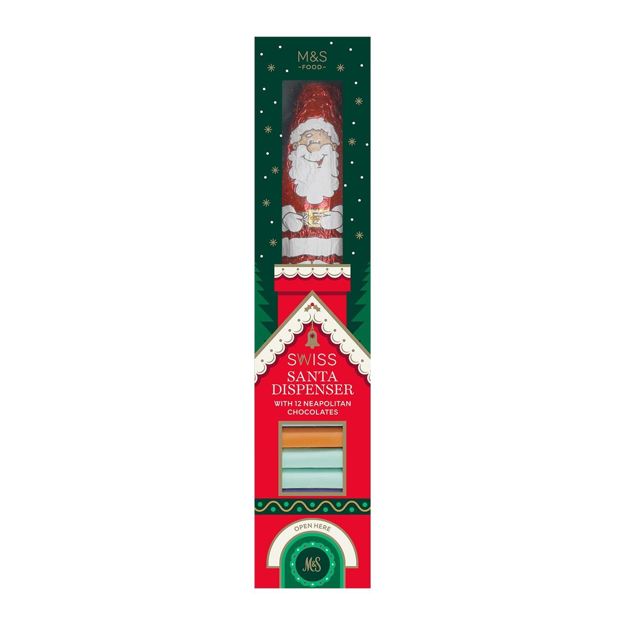 This M&S Swiss Santa Dispenser provides a charming, festive way to enjoy seasonal confectionery during the holidays. The novelty housing unit contains 12 individually wrapped Neapolitan chocolates sourced from Switzerland for quality assurance. Its unique design makes it an enjoyable item to display or gift throughout the Christmas season.