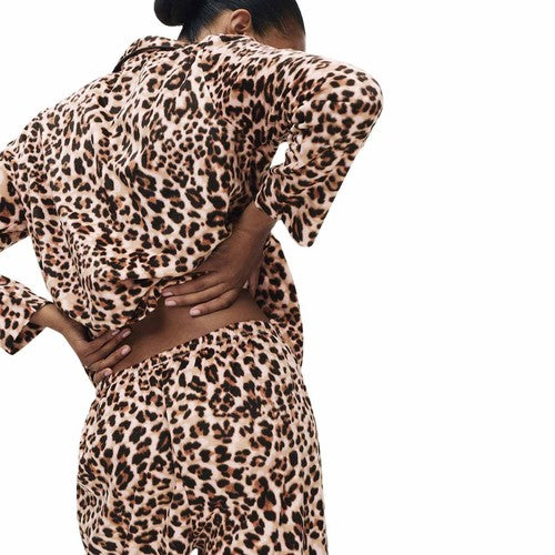 Indulge in comfort with this M&S pajama set featuring a classic silhouette and a bold animal print. The coordinating set includes a long-sleeved, button-down top and matching wide-leg trousers for a complete look. This design blends traditional sleepwear structure with contemporary appeal for restful sleep.