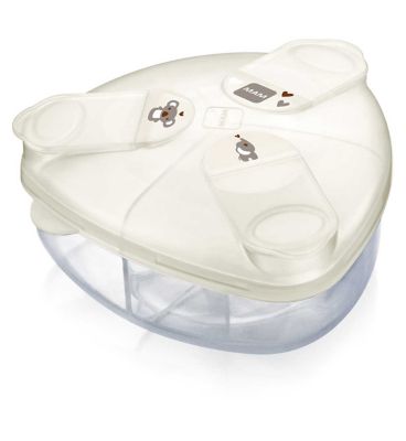 The Milk powder box is a sleek and flat design making it a portable, lightweight storage container that safely holds up to three separate 8oz bottle feeds. The spill-proof lid offers three easy to open snap covers for each compartment, while the whole lid can be removed for easy cleaning and filling.