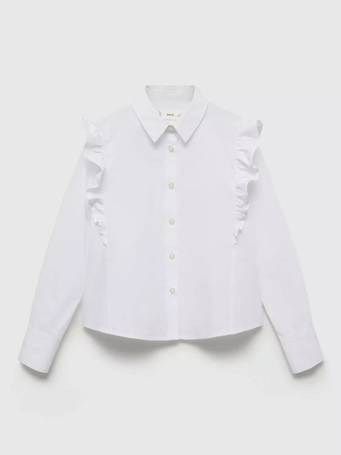 This smart blouse is crafted from soft cotton with ruffle detail around the shoulders. Great for smarter days, it's cut to a straight fit with long sleeves, buttoned cuffs and a simple front button closure.