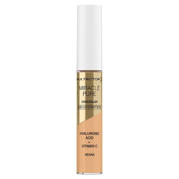believe in miracles inspired by skincare mastered by max factor new miracle pure concealer is clinically proven to care for skin while you wear it the lightweight formula contains hyaluronic acid vitamin c and peptides it gives medium natural coverage and works perfectly on the face and under the eyes providing creaseless all day gentle coverage illuminating brightening and giving 24hydration clinically and dermatologically tested suitable for sensitive skin with a super soft flexible and precise applicator available in 8 shades and designed to work in harmony with max factors miracle pure foundation