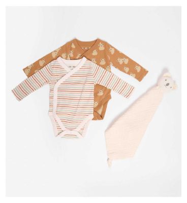 This Maybe Baby two-pack is designed to offer essential comfort and practicality for your little one’s first outfits. The set includes two long-sleeve bodysuits and a matching teddy bear security comforter. These pieces provide soft layering options perfect for updating their initial wardrobe.
