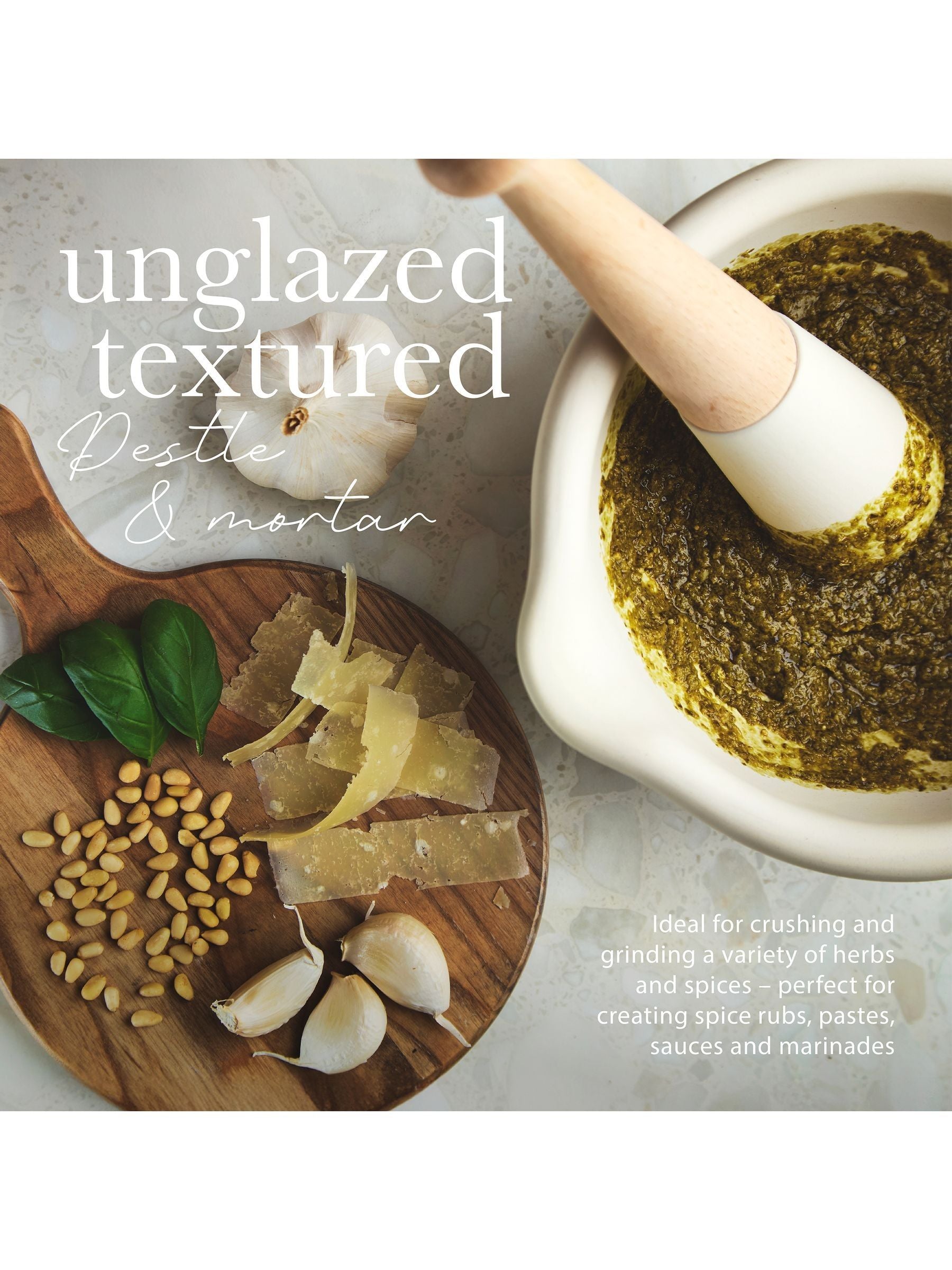 Size 4 Mortar and Pestle. Made from unglazed porcelain with an abrasive finish perfect for crushing and grinding spices and herbs. Unglazed porcelain finish and beech wood handle for a classic look. Vitrified porcelain means no stains/absorption or transfer of odors tastes or bacteria to the next task. Dense structural base for easy crushing and grinding. Use a mild detergent for cleaning. Oven and freezer safe.