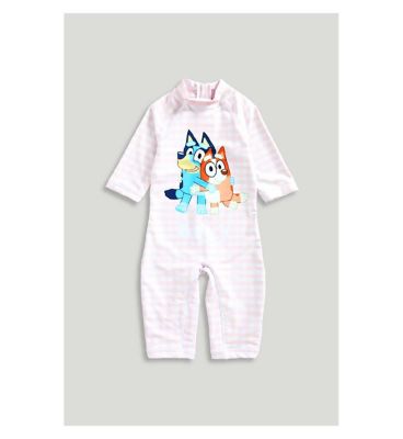Bring Bluey fun to sunny adventures with this character sunsafe suit from Mothercare. Crafted from a lightweight material, this garment provides essential physical protection during outdoor water play. It is designed for comfortable wear while swimming or splashing near the water's edge.