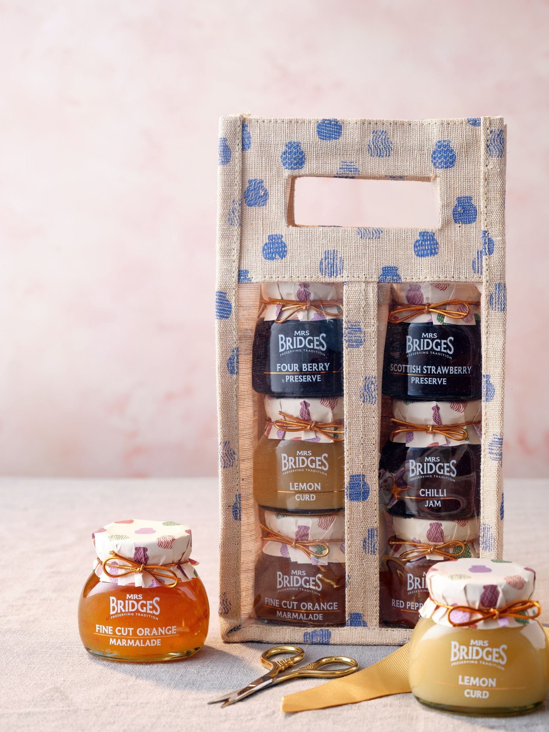 Taste the best of Mrs Bridges, with this delightful handpick of favourites housed in a high-quality reusable juco bag. 113g fine-cut orange marmalade, 113g lemon curd, 113g strawberry preserve, 113g four berry preserve, 100g red pepper and garlic salsa and 113g chilli jam.
