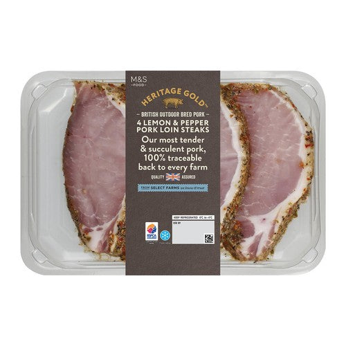 These four M&S Heritage Gold pork loin steaks are ready for preparation and cooking. They come seasoned with a vibrant mix of dried peppers and lemon seasoning. This product features pork sourced exclusively from British outdoor bred pigs, promising a succulent texture.