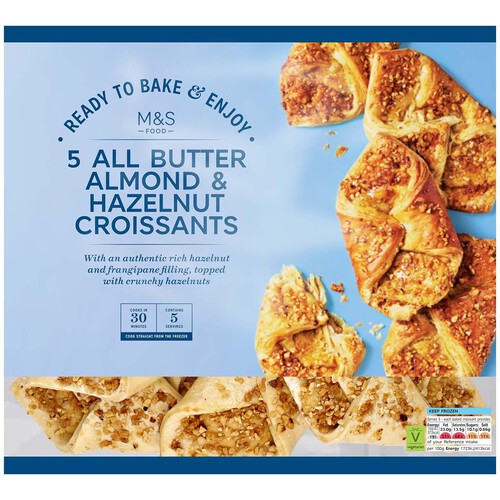 Enjoy freshly baked pastries at home with these ready-to-bake almond and hazelnut croissants. These treats feature an all-butter pastry shell filled with authentic bakers' frangipane. They are topped generously with crunchy hazelnut pieces for added texture and flavour.