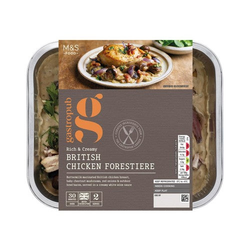 This Gastropub ready meal combines buttermilk marinated British chicken with forest ingredients, offering an elevated taste experience. It features bacon and tender vegetables in a rich, creamy white wine sauce, providing a satisfying dinner option for two.