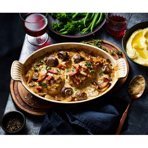 Cooked chicken breasts in a creamy mushroom, white wine and shallot sauce topped with chestnut mushrooms, red onions roasted bacon lardons and parsley