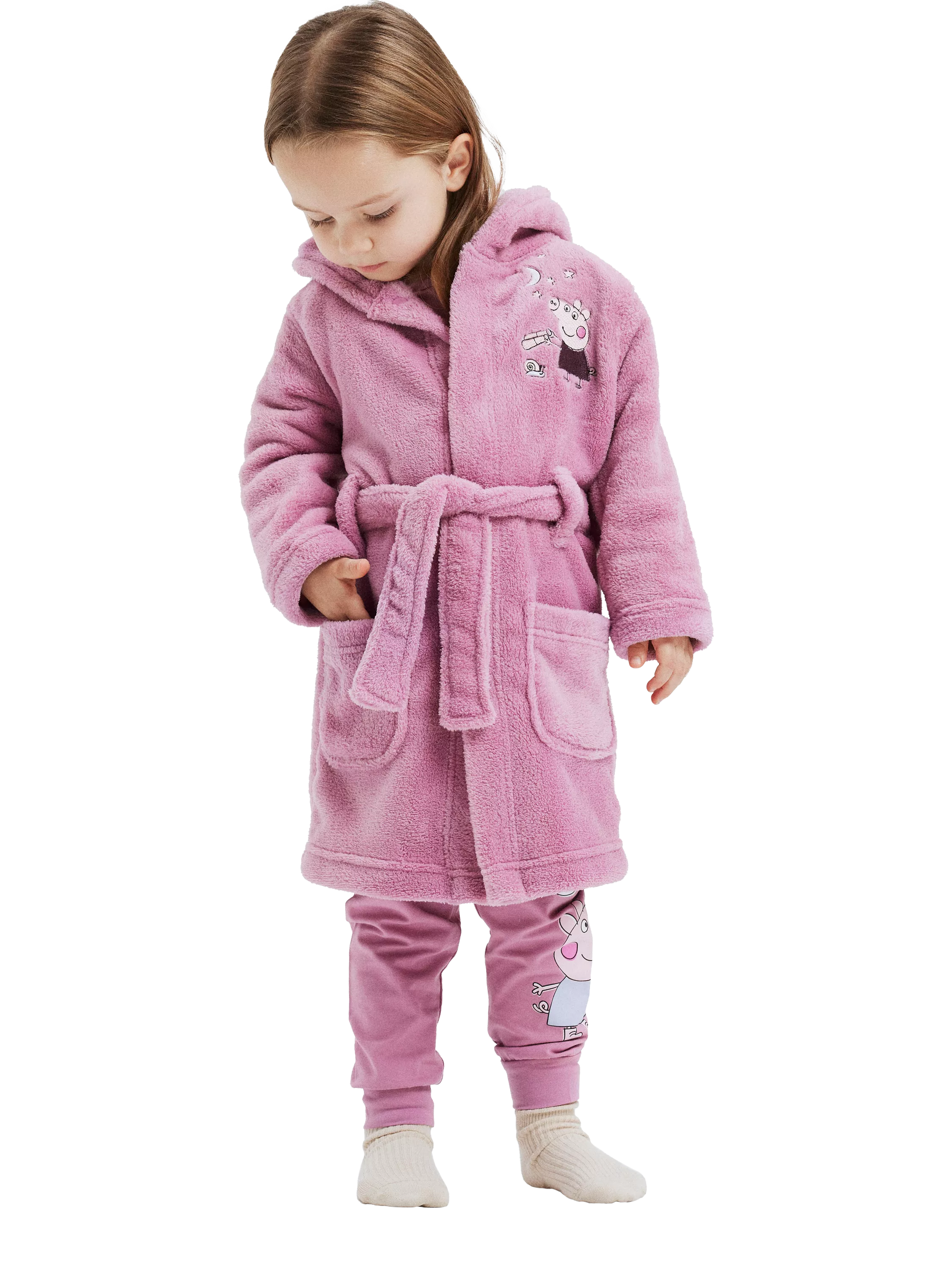 A cosy dressing gown with a hood, tie belt and snap fastening.