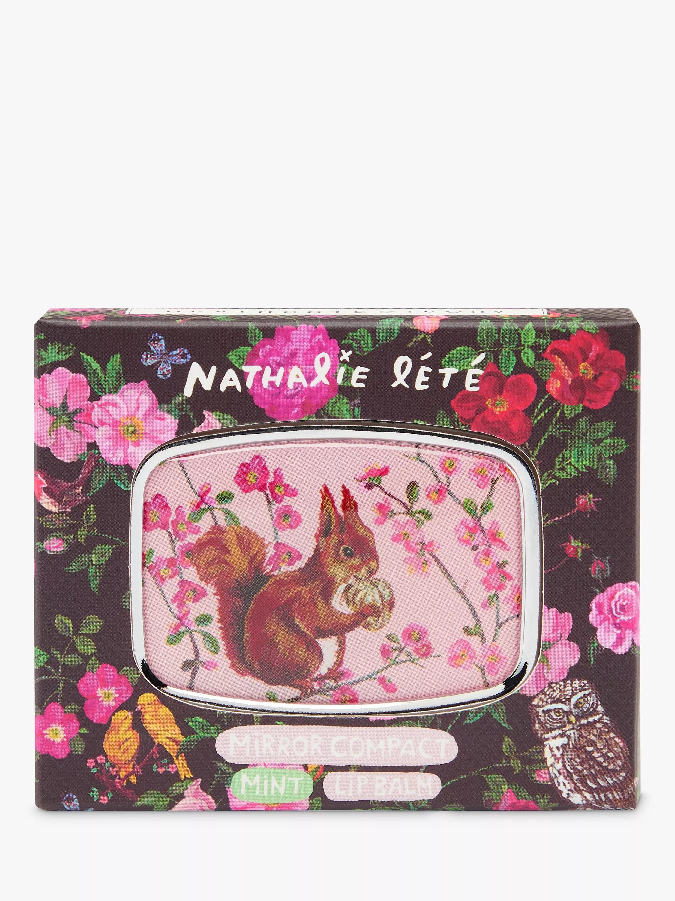 Unlock the magical world of Nathalie Lete with this mint lip balm in a mirror compact with the artist’s red, woodland squirrel.