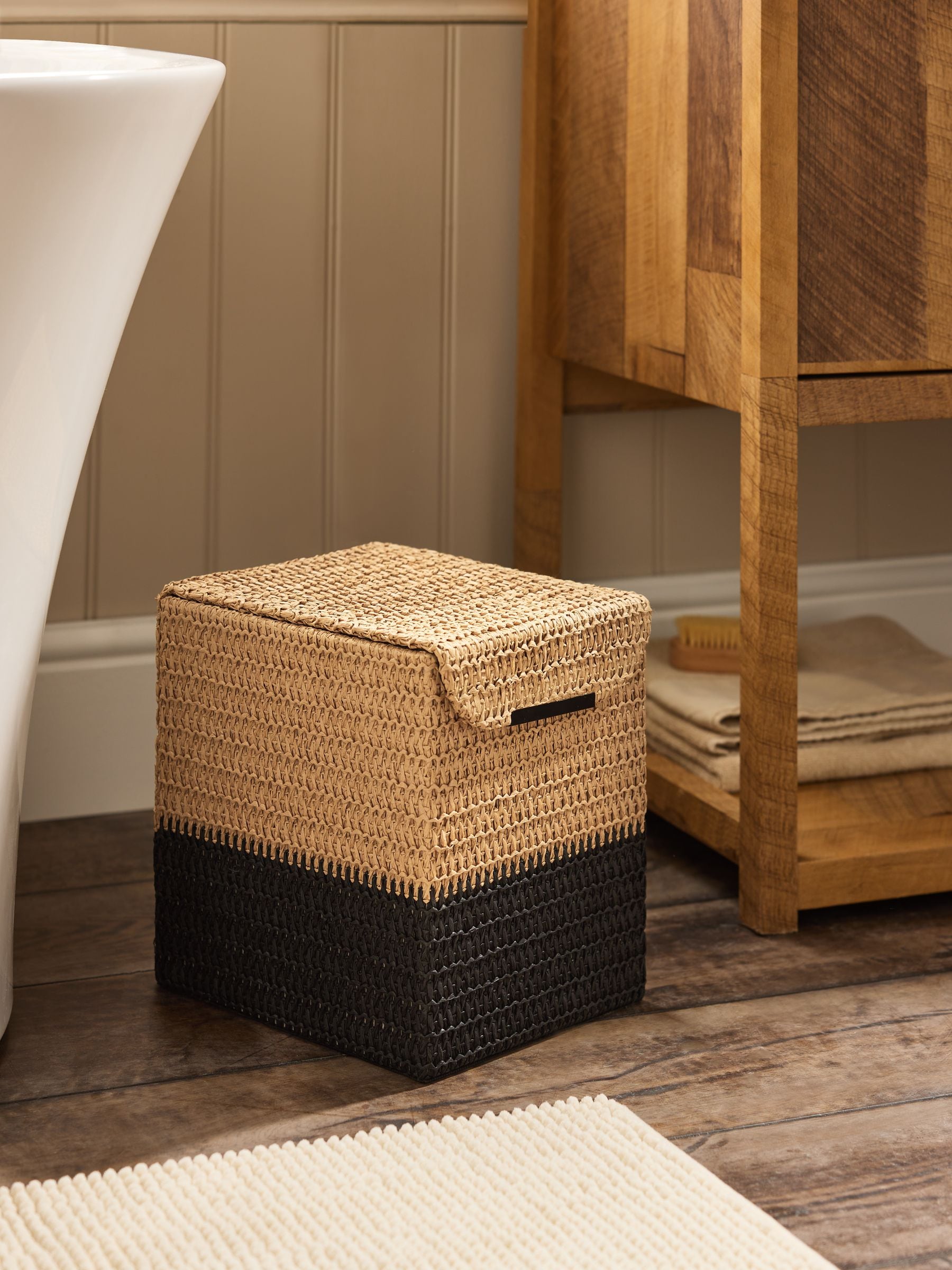 A part of our Bronx bathroom accessories range, this stylish paper woven bin features a plastic lined inside and lid closure.