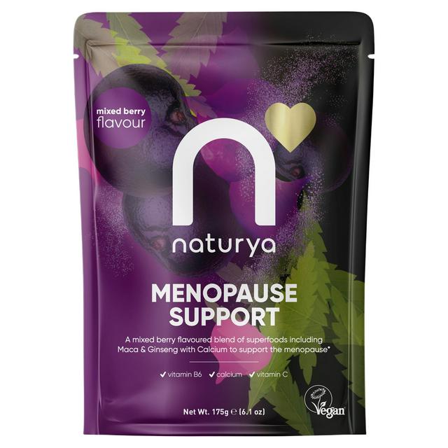 Naturya Menopause Support is a mixed berry flavoured powder blend designed with key nutrients for women over 50. This vegan-friendly formula combines superfoods like Maca and Ginseng with essential vitamins and minerals. It aims to provide targeted nutritional assistance during the menopausal transition.