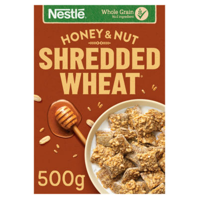 Product InformationGet nutty with Shredded Wheat Bitesize Honey and Nut Cereal. High fibre Bitesize biscuits topped with delicious golden honey and crunchy peanuts. Shredded Wheat has been around for over 100 years when a machine was developed to press the whole grains of wheat into strips, which when baked, became delicious biscuits. The recipe for Shredded Wheat remains unchanged and still to this day, is simply 100% wholegrain wheat. Treat your taste buds & make a healthy choice* at breakfast. *Shredded Wheat is low in saturated. Reducing consumption of saturated fat contributes to the maintenance of normal blood cholesterol levels. Enjoy as part of a healthy diet and lifestyle. Recommended Consumption We believe in “Your Bowl Your Way” so you can enjoy your Shredded Wheat Bitesize Honey and Nut cereals for breakfast in lots of different ways! Add cold or hot milk to a bowl of Shredded Wheat cereals or for a way to add a source of protein and calcium into your breakfast, add a scoop of low-fat yogurt, berries, dried fruit, nuts or honey. Ingredients Whole grain WHEAT (84.7%), sugar, PEANUTS (10.4%), honey (1.9%), glucose syrup, molasses, natural flavourings. May contain PEANUTS and NUTS. Pack Size & Servings 500g, 12 servings See pack for latest ingredients and allergen information.