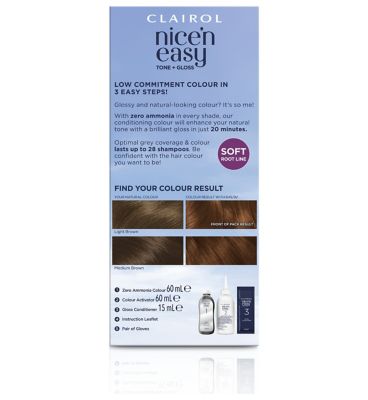 Give your hair the glossy and natural-looking colour it deserves in just 20 minutes! Nice'n Easy Tone+ Gloss has a zero ammonia formula that lasts up to 28 washes for a soft root line for low commitment.