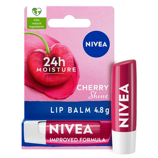 nivea cherry shine lip balm has a delicious cherry aroma and a soft red shine for beautiful lips the vegan formula contains shea butter and melts into your lips leaving them moisturised for 24h