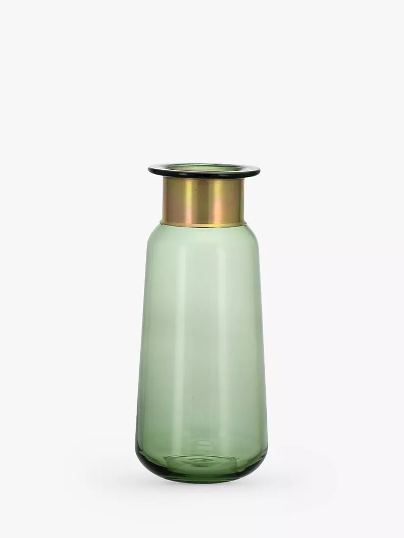 The beautiful Miza vase by Nkuku is perfect for showcasing your blooms, or simply styled on its own on a sideboard. Made from recycled glass with a decorative brass ring at the neck it has been handcrafted by skilled artisans using traditional tools and techniques.
