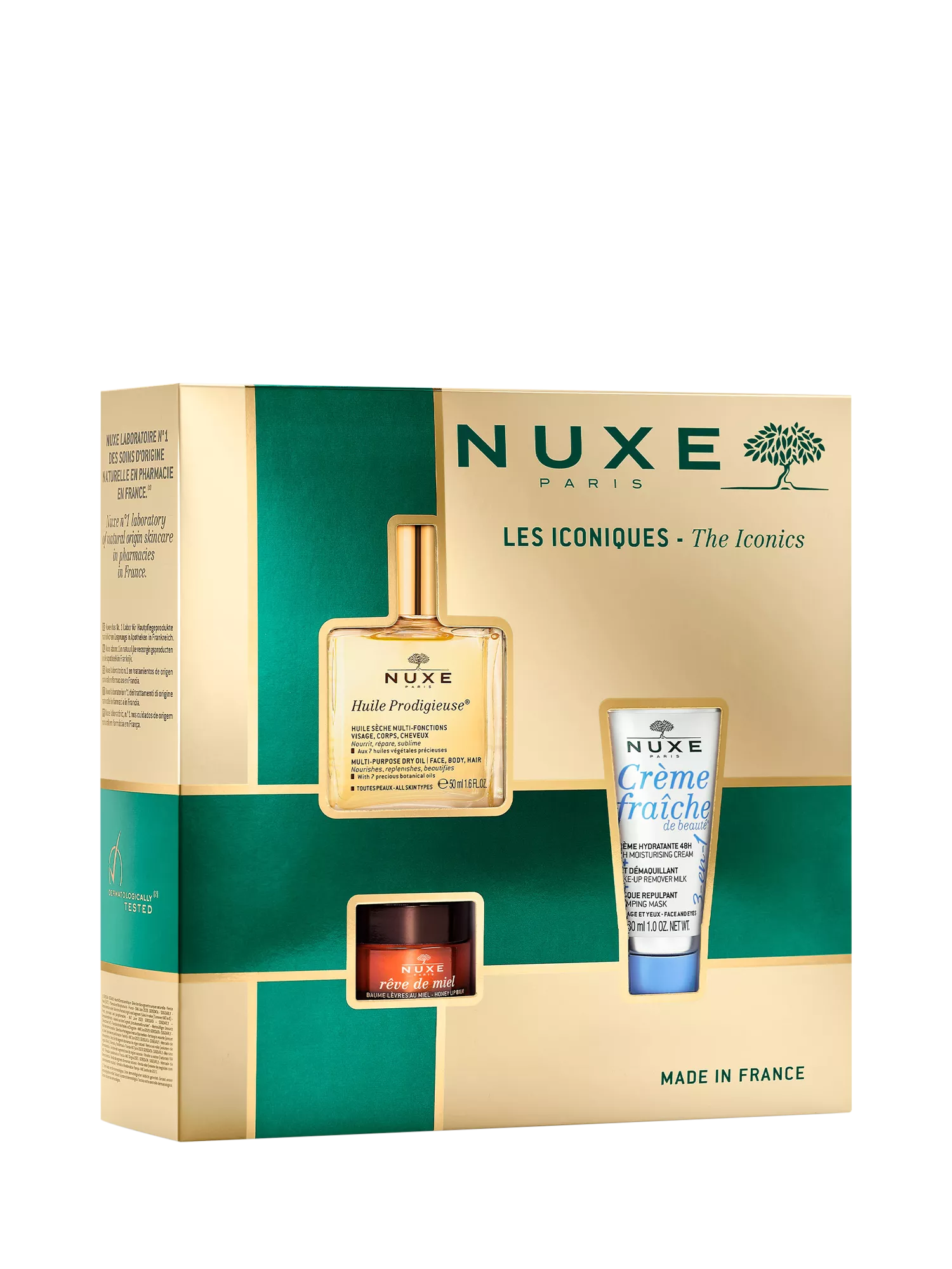 Discover three iconic Nuxe care products to awaken your senses. This Face Care Set contains Huile Prodigieuse®, Crème Fraîche de Beauté® 3-in-1, 48H Moisturising Cream*, Makeup Remover Milk & Plumping Mask and Rêve de Miel Honey Lip Balm Ultra-Nourishing & Repairing.