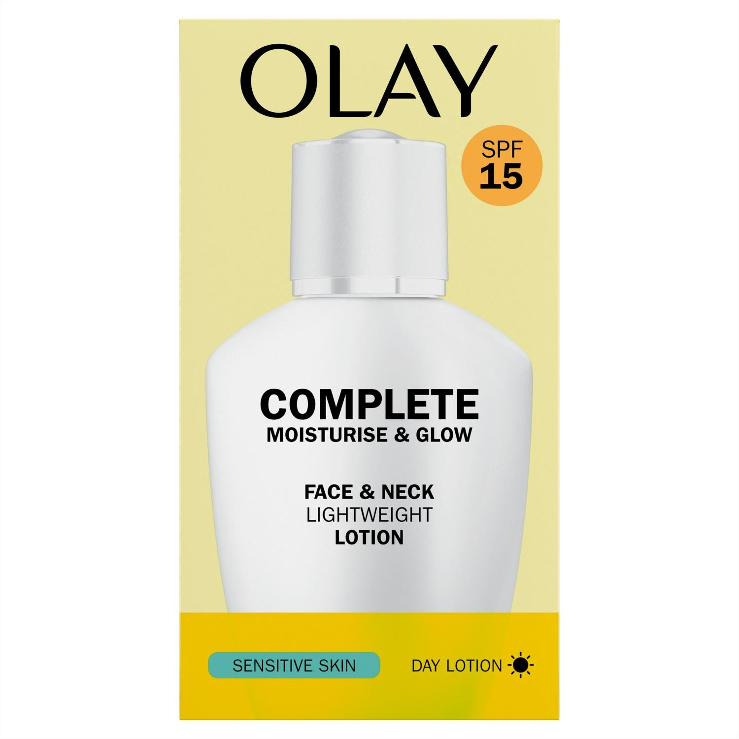 Olay Complete Moisturise & Glow Face and Neck Lotion helps to protect your skin from the damaging rays of the sun with SPF15. It strengthens your skin's moisture barrier for beautiful, healthy glowing skin in just 1 day. A lightweight lotion formulated with 3-IN-1 MULTI-LAYERED TECHNOLOGY: - Skin pampering Vitamin B3, Vitamin E and Pro-V B5; - Nourishing moisturisers that penetrate up to 10 surface layers deep;- SolaSheer Technology helps protect against harmful UVA + UVB rays. Dermatologically tested and specifically formulated to care for your Sensitive skin