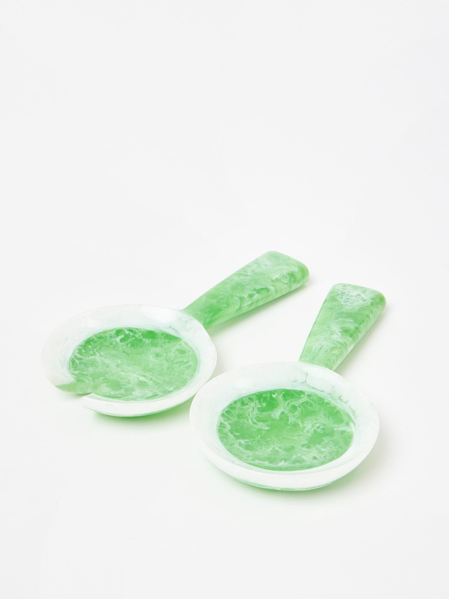 Sculptural salad servers to brighten your tableware. Made from green and white marbled resin, they have a subtle swirl pattern that is unique to each one.