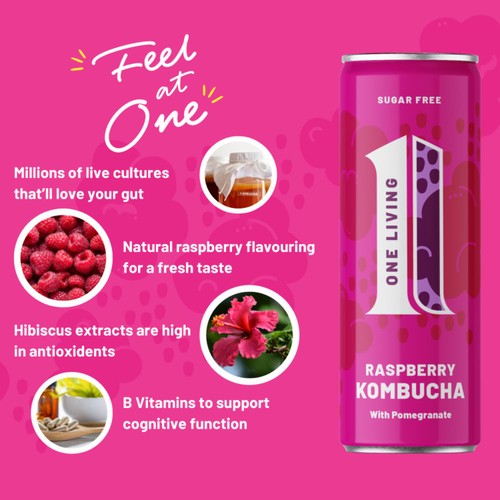 Enjoy the genuinely refreshing taste of One Living Raspberry Kombucha. This drink is authentically brewed to deliver tantalising bursts of flavour without any added sugar. It offers a balanced taste profile featuring raspberry complemented by hints of pomegranate and hibiscus.