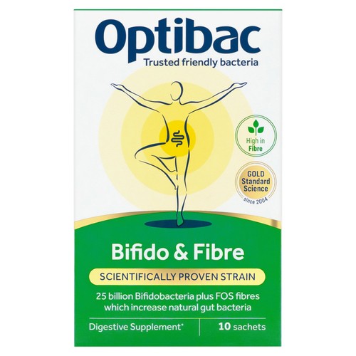 Read MoreOptibac Bifido & Fibre is especially for those seeking an expertly formulated friendly bacteria supplement with FOS for natural fibre. It contains Bifidobacterium lactis BB-12®, as well as 4g of FOS fibres (Fructooligosaccharides) which act as a source of natural fibre and increase your natural gut bacteria. EXTREMELY WELL RESEARCHED - Optibac Bifido & Fibre contains Bifidobacterium lactis BB-12®, which has seen extensive clinical research and is considered the world's most researched strain of Bifidobacteria, proven to reach the gut alive and complement the natural gut bacteria. HIGH IN FIBRE - A symbiotic formula with 4g of FOS fibres (Fructooligosaccharides), providing your suggested daily intake of fermentable fibre*, scientifically proven to increase gut bacteria. *The International Scientific Association of Probiotics & Prebiotics (ISAPP) suggests a minimum daily intake of 3-5g of fermentable fibre such as FOS A VEGAN, MORE NATURAL CHOICE - This digestive supplement is vegan and made using natural ingredients; free from artificial flavourings or colourings often found in other food & drinks containing live cultures; does not cause dependency. A GENTLE FORMULA - B. lactis BB-12® has been researched in and proven suitable for a wide range of life stages including childhood, pregnancy and older age. EASY-TO-TAKE, FLAVOURLESS SACHETS - This powder FOS and probiotic supplement can be taken daily or as required, mixed into cool, non-acidic food or drink, and requires no refrigeration. FROM THE UK & IRELAND’S MOST RECOMMENDED BRAND† - Optibac is the brand of friendly bacteria supplements most recommended by UK and Irish consumers. †See website T&Cs for survey details, 1,500 people, November 2024.