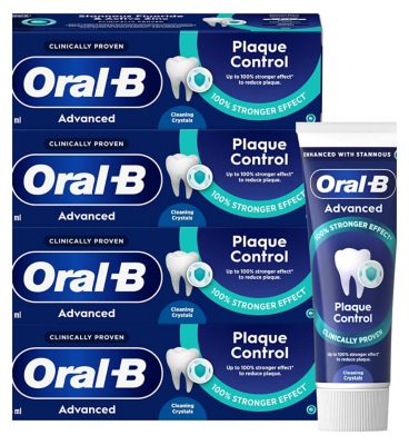 This pack contains four tubes of Oral-B Advanced Plaque Control toothpaste, clinically proven to offer superior cleaning. It delivers up to a 100% stronger effect in reducing plaque compared to ordinary fluoride toothpaste formulations.