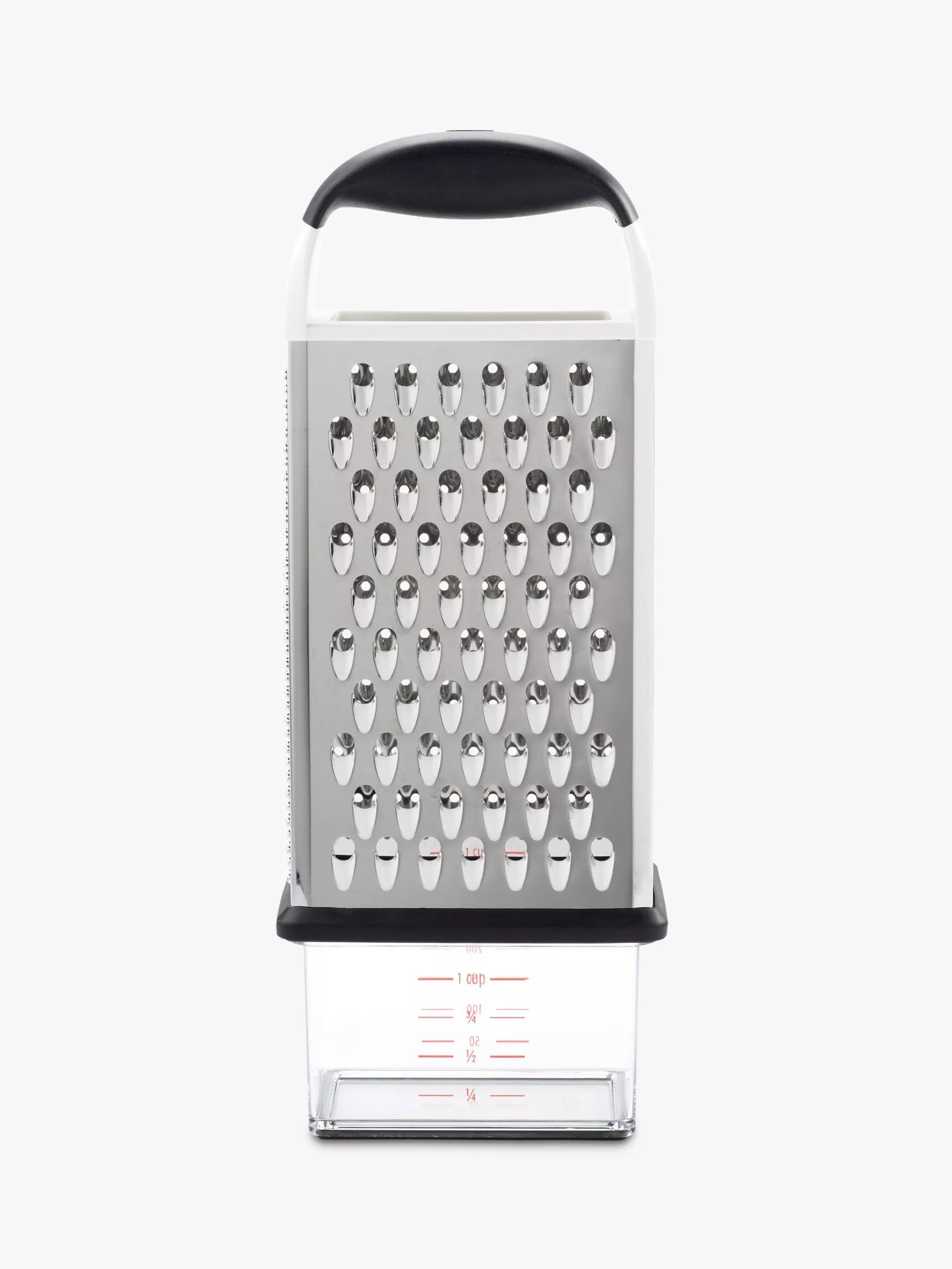The OXO Good Grips Box Grater features four stainless steel surfaces, two wide ones for coarse and medium grating and two slimmer ones for fine grating and slicing. A convenient container with a non-slip base, measurement markings and lid attaches to the bottom for catching and storing freshly grated ingredients. Dishwasher safe for easy cleaning.
