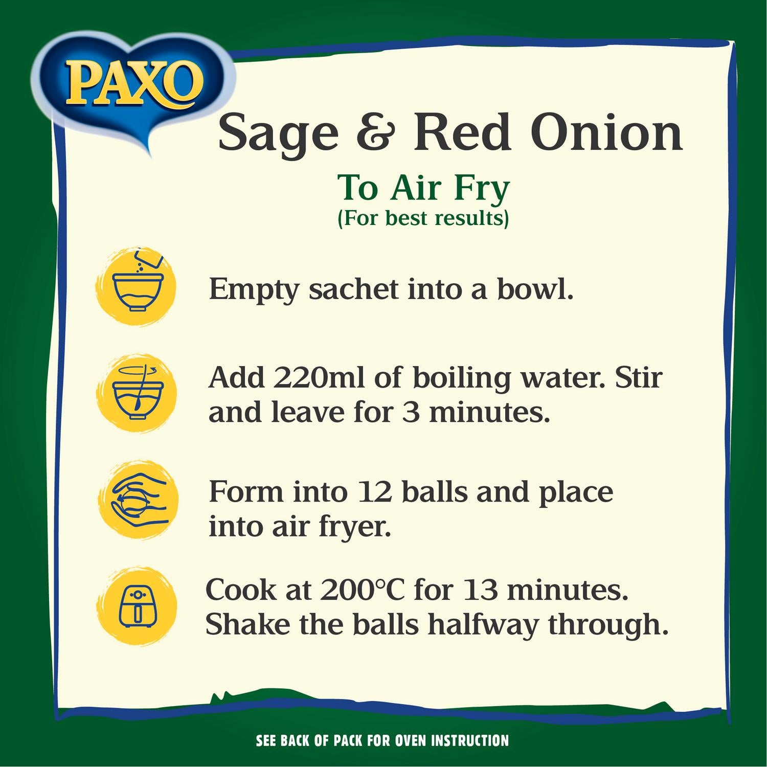 As the UK's No.1 Stuffing Brand* there's so much you can do this holiday season with Paxo Quick Cook Stuffing... Made from our finest ingredients, this hearty stuffing is crispy on the outside and fluffy on the inside, delivering mouth-watering aromas and rich flavours thanks to a blend of tasty herbs and seasonings. It's simple to make - just combine the stuffing mix with boiling water, mix well and leave to stand for three minutes. Form the mixture into approximately 12 stuffing balls, then it is ready to air fry in 13 minutes or bake in 18 minutes. No Christmas roast is truly complete without the perfect finishing touch of the Nation's favourite stuffing! But Paxo also offers a great way to add texture and flavour to all kinds of other dishes. Sprinkle into soups, stews and casseroles to add a delicious flavour and texture. Or try on top of pasta bakes, pork chops, steaks and fish to add a delicious crunch and flavour. Nation's favourite stuffing† † Paxo is the No.1 best selling ambient stuffing brand. Source: Circana, Major Mults, Market Data for Great Britain, 52 weeks up to and including 06/09/2025"